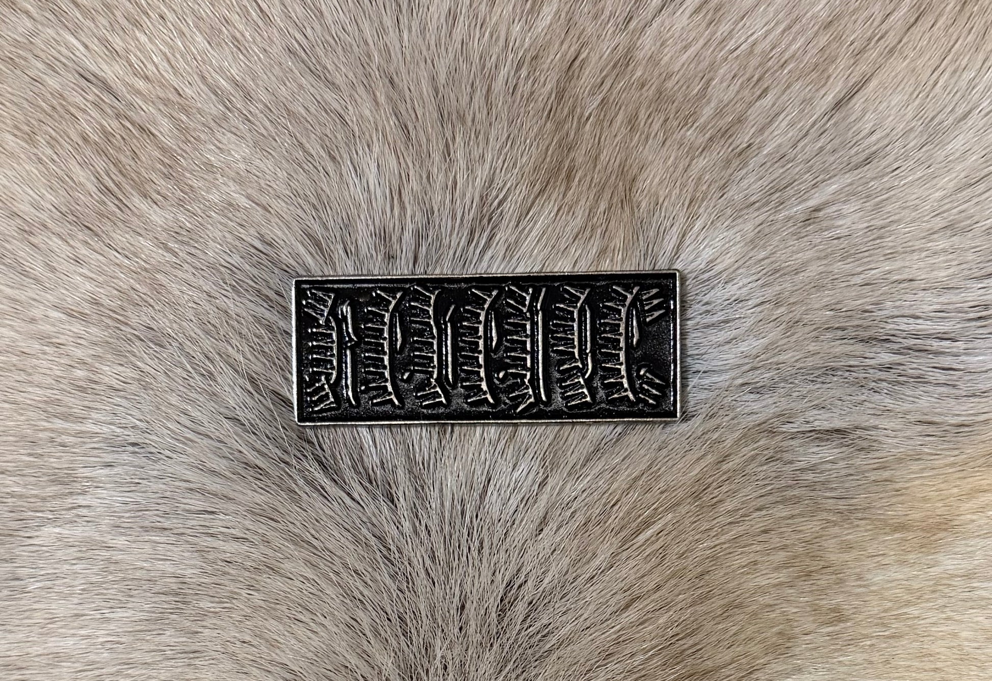 Cast metal pin badge with butterfly clutch attachment.